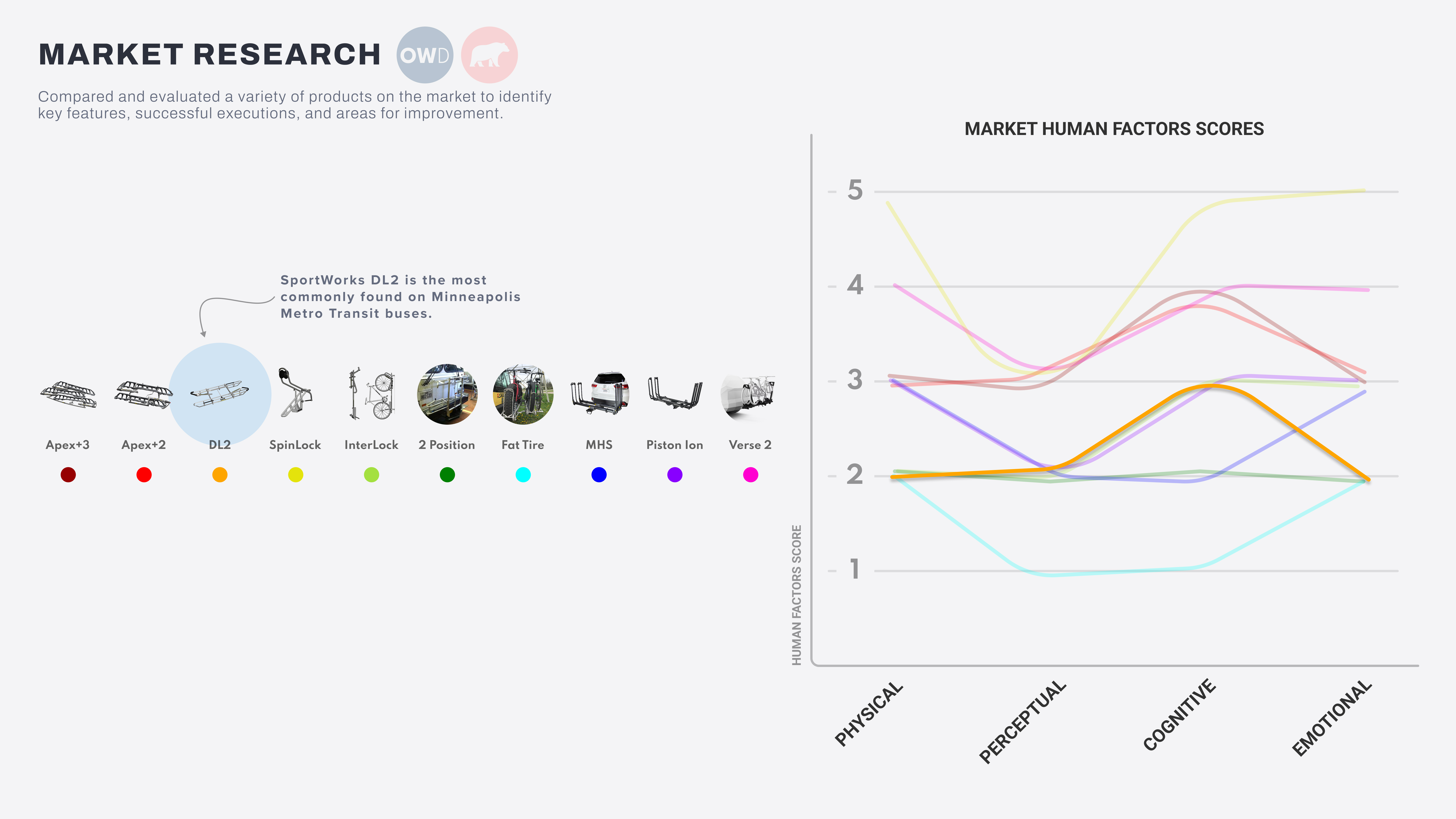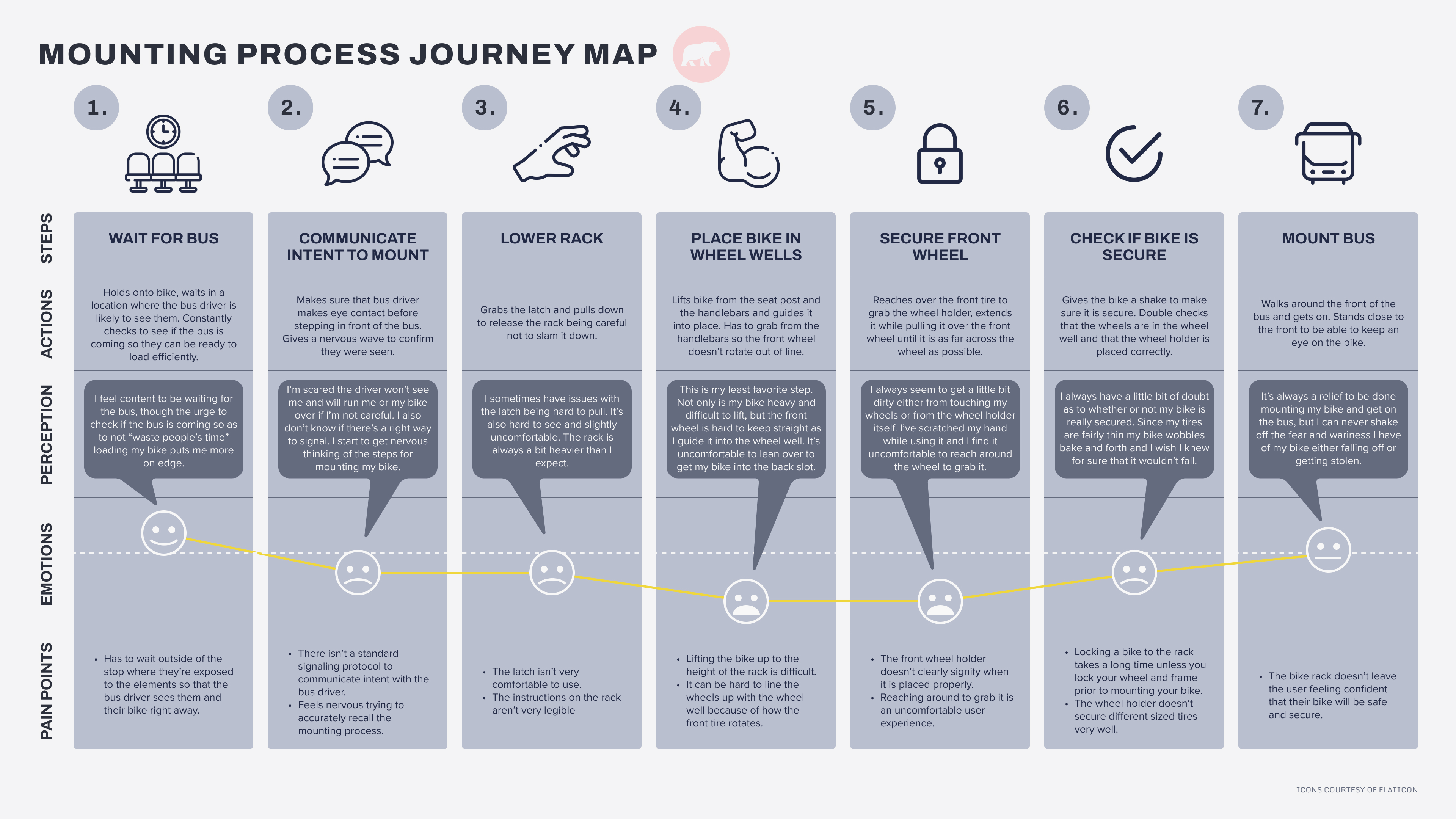 This project was a paired group effort for a Human Factors and Ergonomics course. The intensive research process, working alongside users consistently, led to a solution that addresses a variety of user concerns with the current bus bike racks used across the United States.